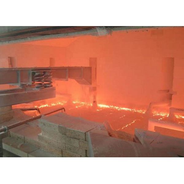 Batched materials feed into the furnace through dog house, the heat is transferred via flame space to the glass liquid.